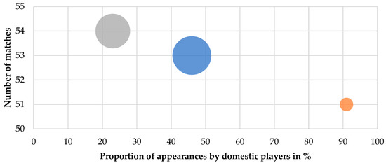 This is a result that speaks of the relatively important role of foreign players in the clubs that they play for in national leagues. The percentage of foreign players’ appearances has an important position mainly because of increasingly strong voices and the implementation of quotas for foreign players in individual teams. Former FIFA President Sepp Blatter [16,18] was a major supporter of such quotas. His view had many supporters, but also critics such as Hardman and Iorwerth [11].