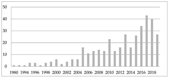 In total, 373 articles were analyzed. The first publication about spiritual leadership was recorded in 1980 on the Scopus database, the next one was recorded in 1989, and then another in 1994. Since then, the number of spiritual leadership articles has increased, as shown in Figure 1. Although in 2018, the number of publications about spiritual leadership is observed to decrease slightly (as shown in Figure 1), the entire graph can be characterized as a cyclical increase.