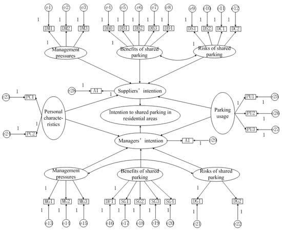 In addition, e1–e27 were the errors of each observable variable. Since the economic benefits can compensate for the cost in the shared parking, double arrows were used to represent the relationships between benefits and risks that affect each other. Similarly, management pressures and shared risks were linked by two-way arrows.