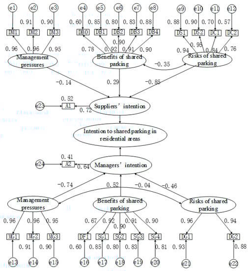 (1) The path coefficient between management pressures and managers’ intention was −0.74, with the largest proportion among the influential factors. The path coefficients of the observable variables of management pressures (MG1–MG3) were 0.96, 0.96, and 0.95, respectively. In order to improve the parking managers’ intention in shared parking mode, it is necessary to reduce the pressures of the managers by increasing the salary and establishing a new supervision mechanism.
