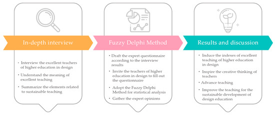 In-depth interviews were conducted on the topic of “effective teaching activities”. When drafting the interview outline according to the abovementioned key issues, this study adopted purposeful sampling and semi-structured expert interviews to explore their perspectives on a particular idea, program, or situation [36]. Excellent teachers of higher design education were chosen as the interviewees to explore the “elements and meaning of high-quality teaching”. The interviews contained the following five dimensions: (1) Teaching faith, (2) observations of social development and talent demands, (3) preparation for teaching, (4) the teaching-learning interactions, and (5) after-teaching review of excellent teachers of higher design education.