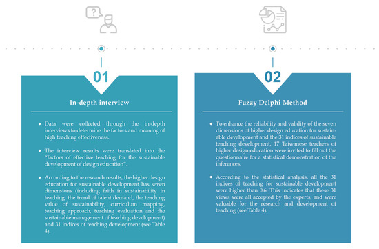 The United Nations 2030 Sustainable Development Goals (SDGs) is designed to improve people’s lives through high-quality education and make it the foundation of sustainable development. To obtain the collective opinion, reach a consensus among the experts, and establish a standard framework, this study designed the items of the expert questionnaire according to the “Elements of Effective Teaching and Activities of Sustainable Development”, as based on the results of the expert interviews, which were analyzed by the fuzzy Delphi method (Table 4). The items focused on evaluating the appropriateness and importance of the measurement dimensions, the factors, and the indices. In terms of questionnaire design, the higher design education for sustainable development was divided into seven dimensions: (1) Faith in sustainability in teaching, (2) the trend of talent demand, (3) the teaching value of sustainability, (4) curriculum mapping, (5) teaching approach, (6) teaching evaluation, (7) the sustainable management of teaching development, and 31 indices of evaluating sustainable teaching development. The aim was to explore new educational models and create an environment that fosters both teaching and learning. The questions and statistical results of the questionnaire, as based on the fuzzy Delphi method, are shown in Table 4. Figure 4 reveals the methods and results of the research on design education for sustainable development.