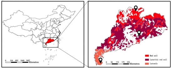 Distribution of the three types of acidic soils in Guangdong Province, China, and the locations of the three sampling sites.