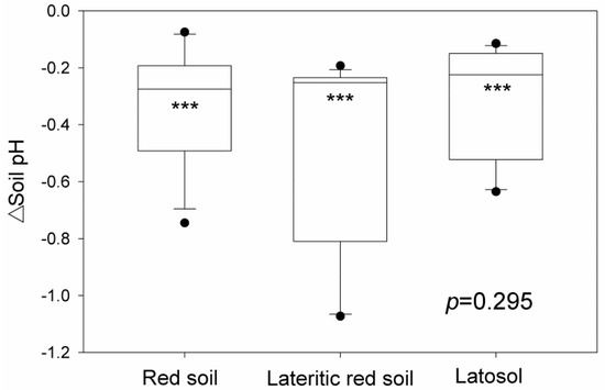 Changes in the soil pH (ΔSoil pH) under the simulated acid rain treatments relative to the control in the three soils. The statistical p value is calculated by one-way analysis of variances to indicate the significance level of ΔSoil pH among soil types, while *** within each bar indicate that the mean ΔSoil pH is significantly different from zero at the significance level of p < 0.001. Solid circles present outliers of the observed values identified by the interquartile range method.