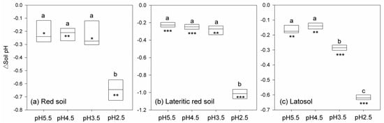 Changes in the soil pH under the simulated acid rain relative to the control treatments (ΔSoil pH) in the three soils: (a) red soil; (b) lateritic red soil; (c) latosol. The pH 5.5, pH 4.5, pH 3.5, and pH 2.5 stand for the four levels of simulated acid rain treatments, with the pH of simulated acid rain being 5.5, 4.5, 3.5, and 2.5, respectively. In each panel, different lowercase letters above the boxes indicate significant differences among the treatments. The stars indicate that the ΔSoil pH is significantly different from zero, with *, **, and *** indicating the significance level of p < 0.05, 0.01, and 0.001, respectively.