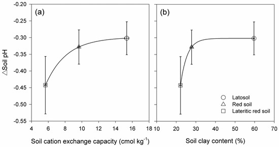 Dependence of Changes in the soil pH (ΔSoil pH) after treatments relative to the control on the soil cation exchange capacity (a) and clay content (b). The signals present the mean values of ΔSoil pH for the three soils under different treatments.