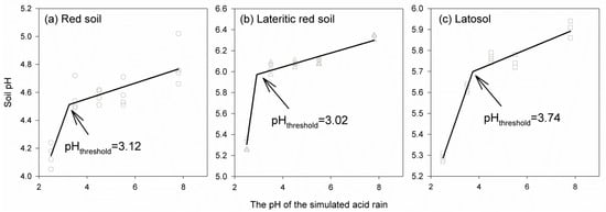 Changes in the soil pH in response to pH of the simulated acid rain in the three soils. The polylines are fitted using the two-segment function, with the inflection point indicating precipitation pH threshold (pHthreshold). The soil pH could rapidly decline when receiving an acid rain with pH below the threshold.