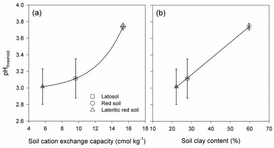 Moreover, the pH threshold is considerably different among the three soils in this study (Figure 5), an observation supporting our expectation that soils with different physiochemical properties could have different tolerance capacity to acid stresses. However, the result of higher pH threshold in the latosol that has high soil pH, clay content, and CEC is unexpected, because we thought the soil properties that are beneficial to buffering exogenous acid inputs would also maintain at a relatively low pH threshold for the given soil; in other words, it may be harder for the soils with higher soil acid-buffering capacity to reach the critical point below which soil pH will be rapidly reduced even under a comparable acid rain stress. On the contrary, positive relationships between the pH threshold and soil CEC or clay content were observed in this study (Figure 6). However, soil pH buffering capacity, as well as the pH threshold, should not be simply determined by the clay content, but also affected by other properties such as clay type and mineralogy. For instance, 2:1 clays such as hydroxy-interlayered vermiculite have greater soil pH buffering capacity, while some 1:1 clays could be more sensitive to the acid inputs due to their relatively lower pH buffering capacity [43]. Further studies combining microstructure and mineralogy analyses could be helpful to reveal the potential reasons of the observed relationships. Although the potential mechanisms deserve further studies, this scenario in the present study suggests that soils of higher CEC and clay content, with lower changes in the soil pH under acid rain conditions (Figure 4), could be easily affected by relatively weak acid rains. With the three soils as examples, acid rain of the pH being 3.5 could result in a rapid decline in the latosol, but it may only slightly decrease the soil pH in the red soil and lateritic red soil.