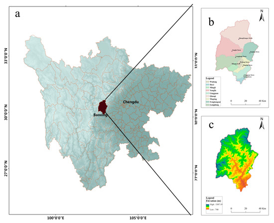 Location of Baoxing County, China, indicating: (a) The location within Sichuan Province, (b) the administrative divisions, and (c) Digital Elevation Model.