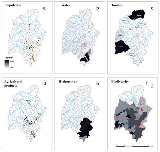 Spatial distribution of ecosystem service demand in Baoxing County, China, including: (a) Population distribution, (b) water demand, (c) tourism, (d) food demand, (e) hydropower demand, and (f) biodiversity conservation.