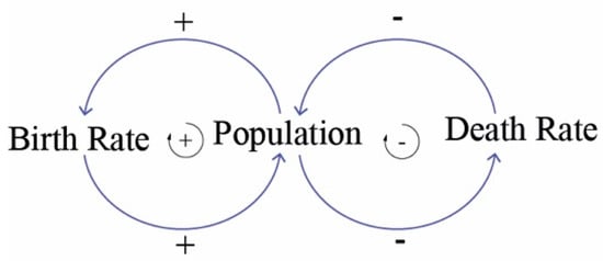In SDM, complex and dynamic systems are described both in qualitative/conceptual and quantitative representations. The qualitative modelling is performed by the causal loop diagram (Figure 1). This tool is used to graphically represent the feedback loops structure of the system. Causal loop diagram (Figure 1) describes the basic mechanism of the system, in order to represent the causes of its dynamics behavior over time [50,56]. The relationships between the variables can be either positive or negative, as shown in Figure 1. A positive relationship signifies that variables change equally. By contrast, a negative relationship means that the variables change inversely.