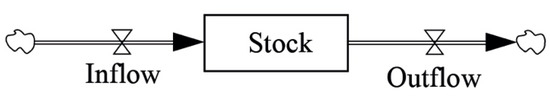 Quantitative modelling is represented by stock and flow diagram (Figure 2). Stock is the first basic building block in SDM and it represents the variable which describes the condition of the system at any particular time [12,50,57,58,59]. Flow is the second block in SDM and it tells how stocks change over time.
