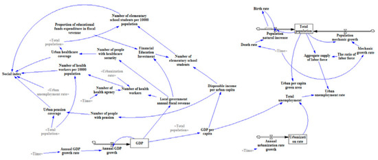 In this section, the application of SDM developed by Tan et al. [13] to the case study of Beijing (China) is considered for the illustration of the fundamental steps of the procedure and the typology of results that the method is able to deliver. In [13], the SDM are applied to simulate the urban sustainability performance of the city, considering three different development scenarios. The SDM has been developed following these steps: (1) identifying the key variables by a review of urban sustainability indicators; (2) building the stock and flow diagram to identify the relationships between the variables; and (3) simulating different scenarios. Figure 3 shows the stock and flow diagram of the social sector. In particular, the stocks of the diagram are (1) Total population, (2) Urbanization rate, and (3) GDP, whereas all the other variables represent the flows. The diagram also shows the relationships that exist among the considered variables. As an example, we can consider the relationship that exists between “local government annual fiscal revenue” and “financial educational investment”. That means the investment in educational fields strictly depends on the availability of government financial resources. It appears clear that the SDM model tries to describe the real-world functioning through its stock and flow diagram, based on real behavior.