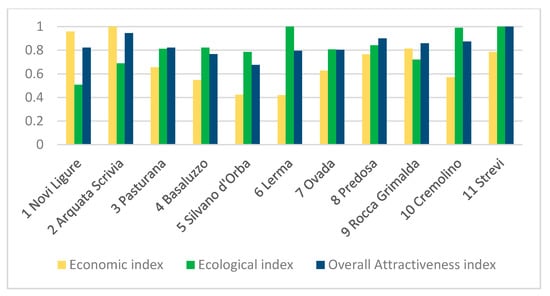 The histogram illustrates the ecological indices, the economic indices and the Overall Attractiveness index that were calculated for the considered 11 Clusters (Elaboration from Assumma et al., 2018).