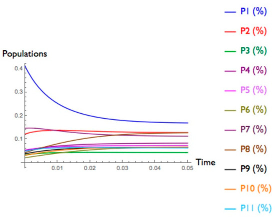 The results of the model are useful for predicting possible future evolutions about the mobility of resident populations. As shown in Figure 6, the first group of populations (P1–P4) behave similarly in the transitory time, with an exception for population (P1) because of a consistent degrowth. The second group of populations (P5–P8) behave differently; in fact, the population of the cluster of Novi Ligure (P5) is interested by a slight degrowth, the population of the cluster Lerma (P6) grows significantly and finally, populations of the clusters of Ovada and Predosa (P8 and P9) show similar growing behaviors. In this sense, the poles were intended as receptors of the considered territory that absorb and evolve toward a new state, as already said, with respect to ecological and economic aspects. The predicted scenarios on population dynamics were interpreted as the effects of the non-linear interactions between the ecological and economic components with the multi-pole territorial system. In fact, when the multi-pole territorial system shows a good equilibrium between ecological and economic aspects, the population grows significantly, as in the case of the population of the cluster of Predosa (P8); whereas when one of the considered components records negative values, the population decreases, as in the case of the population of the cluster of Novi Ligure (P1).