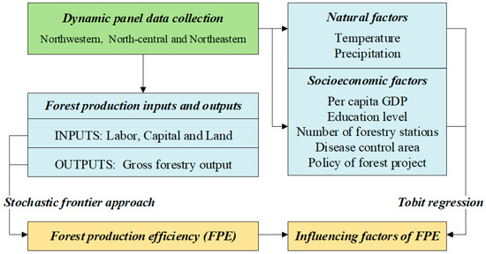 With development of panel data, dynamic efficiency estimation and factor analysis gradually promote the efficient environmental management and provide scientific evidence for decision-making. This study focuses on the model for production efficiency evaluation, aiming at providing the basis for supporting scientific evidences for forest resource and environment management. In this paper, we collected the natural and socioeconomic dynamic panel data on forestry industry in the TNSFP region. We applied the SFA method to estimate the FPE values for 13 provinces within the TNSFP region for the period 2000–2016. We subsequently used the Tobit regression models to explore the effects of natural environmental and socioeconomic influencing factors on FPE. We further analyzed differences in the impacts of the influencing factors among the three sub-regions. Our findings indicated an increase in the annual mean value of FPE from 0.3147 in 2000 to 0.5681 in 2016. In general, the FPE values obtained for the northeastern sub-region were relative higher than the values obtained for the other sub-regions, with similar FPE values obtained for three provinces in northeastern sub-region (Jilin, Liaoning, and Heilongjiang) during the period 2000–2016. The FPE value for Xinjiang in the northwestern sub-region evidenced a rapid increase, reaching the highest level among the 13 provinces in 2016. Moreover, the north-central sub-region evidenced relative FPE values. The overall trend for changes in the spatial characteristics of FPE revealed a shift from “high in the west and low in the east” in 2000 to “high along the two sides and low in the center” in 2016. Among the influencing factors, the effects of temperature, rain, disease area, per capita GDP, forestry employees’ education levels, and the number of forest technology stations on FPE were all significantly positive, whereas those of the policy directive relating to the Natural Forest Protection Program on FPE were insignificant. All of the findings would contribute to the effective forest management and regional sustainable development.