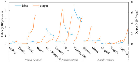 Changes in labor and output in the 13 provinces from 2000 to 2016.