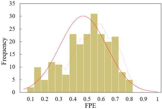 The distribution of the efficiency should conform the underlying hypothesis of the SFA model. Figure 4 shows the distribution of the 221 FPE values of the 13 provinces from 2000 to 2016 was skewed to the left. Almost half of the 221 FPE values ranged between 0.4091 and 0.5924. The FPE values were more than 0.5924 in 24.89% and less than 0.4091 in 21.26% of the 221 observations.