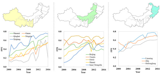 Our estimation indicated that the average FPE values for the 13 provinces were 0.3147 in 2000 and 0.5681 in 2016, thereby showing an increase by 80.52%. The finding indicates that the FPE status has remained relatively inefficient. From 2000 to 2016, fluctuations in the FPE values increased, as shown in Figure 5. Two distinct phases relating to changes in spatial characteristics were identified: 2000–2010 and 2010–2016. There was an evident increase in the FPE value of the entire TNSFP region during the first phase (2000–2010). The FPE values of 12 provinces (excluding Tianjin) also increased to some extent. The increase in the FPE value of Xinjiang from 0.2070 to 0.7104 was most apparent, while that of Tianjin evidenced a weak decreased from 0.6225 to 0.6009. The FPE values of the northwestern and northeastern sub-regions evidenced relatively steady increases in FPE during the second phase (2010–2016) compared with their values during the first phase, but temporal changes in FPE values during the latter period were weakly inverted in the north-central region. In particular, the PFE values obtained for Inner Mongolia and Qinghai showed evident decreases. On the whole, the FPE values and their changes within the different provinces in the northwestern region varied during this whole phase. The FPE values in the north-central region varied during the first phase of the study but remained relative consistent during the second phase. However, the FPE values in the northeastern region remained consistent throughout the whole period.