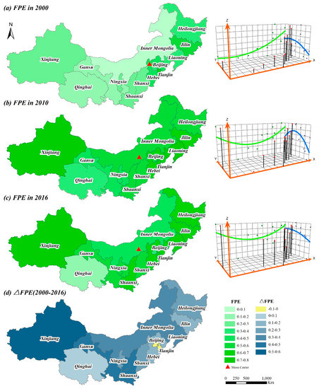 The spatial changes from 2000 to 2016 in FPE values are depicted in Figure 6. The spatial characteristics in 2000, 2010, and 2016 were explored through trend surface analysis. The spatial characteristics changed evidently during the period 2000–2016. In 2000, the overall trend was one of a decrease in FPE moving from east to west. The northeastern region evidenced relatively high FPE values (0.5544 in Jilin, 0.3893 in Heilongjiang, and 0.32193 in Liaoning) while the FPE values in the north-central region ranged between 0.0999 (the value for Inner Mongolia, which was the lowest) to 0.6225 (the highest value calculated for Tianjin). FPE values were relatively consistent in the northwestern region but were generally the lowest of the values obtained for the three sub-regions, ranging from 0.1378 (Gansu) to 0.2562 (Shaanxi). Over time, the geographical spatial distribution characteristics of FPE changed, mainly in the northwestern region. In 2016, the FPE value in the central section of the TNSFP region was lower than the values in the western section (the highest FPE value was obtained for Xinjiang at 0.7451) and in the eastern section (the lowest FPE value of 0.2035 was obtained for Qinghai). Moreover, from 2000 to 2016, the mean center of the FPE values is concentrated in the east-central of the TNSFP region, at the border of Hebei and Inner Mongolia. The mean center varies slightly from east to west during the research period. As for the changes of FPE values in each province, there are evident differences among the 13 provinces. The FPE values in Beijing and Tianjin decreased by 0.0007 and 0.0215 from 2000 to 2016, respectively. Except Beijing and Tianjin, the FPE values in other provinces increased at different degrees. The FPE change in Xinjiang was 0.5381 (highest among the TNSFP region) and that in Qinghai was 0.0657 (lowest among the TNSFP region).