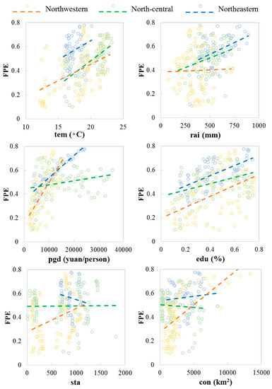The Tobit regression models confirmed the relationships existing between the influencing factors and FPE, but the variations in these relationships among the three sub-regions had not been revealed, respectively. The scatter plots shown in Figure 7 depicted the trend lines between the FPE values and each influencing factor. The contributions of the average temperature from April to October (tem) on FPE were similar and the intensities (slope of the trend line) were similar across the three sub-regions. The temperature factor made significant positive effects on FPE in the three sub-regions. The effects of the total annual rainfall (rai) on FPE were evidently positive in the north-central and northeastern sub-regions but were weak in the northwestern sub-region. Per capita GDP (pgd) had positive effects on FPE in all the three sub-regions, with the strongest effect in the northwestern sub-region, followed by the northeastern and north-central sub-regions. The effects of the education level of forestry employees (edu) were positive in all three sub-regions, with the north-central sub-region evidencing the weakest effect. The number of forestry technology stations in townships (sta) had a negative effect on the FPE in the northeastern sub-region, a positive effect in the northwestern sub-region, and an insignificant effect in the north-central sub-region. The effect of disease and pest control areas (con) was more strongly positive in the northwestern sub-region than in the northeastern sub-region, and its effect was clearly negative in the north-central sub-region.