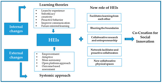 The use of learning processes and a systemic thinking approach in HEIs requires re-evaluation and revision of knowledge creation and a dissemination approach that can increase their contribution to CoSoI [85,86]. Learning and systemic adaptation involve various mechanisms through which HEIs can improve the capacity and capabilities of co-creation for social innovation. The co-creation aspects focus on collaboration and social interaction which can bring integration of knowledge/experiences and resources. The learning and systemic thinking process involves various activities such as knowledge sharing, collective research, and experimentation and critical thinking and reflexivity which transform the capacity of HEIs towards CoSoI [63,86]. These processes reshape the structure and relationship which involves a change in the power structure and redefine the collective meaning, which finally results in a change in attitudes, behavior, knowledge, and skills. Social learning and a project-based learning approach in teaching and curricula are used to develop critical thinking, independent problem-solving skills as well as working in a team. Furthermore, the systemic approach allows the development of multiple viewpoints to understand a problem and provide a holistic approach to decision-making.