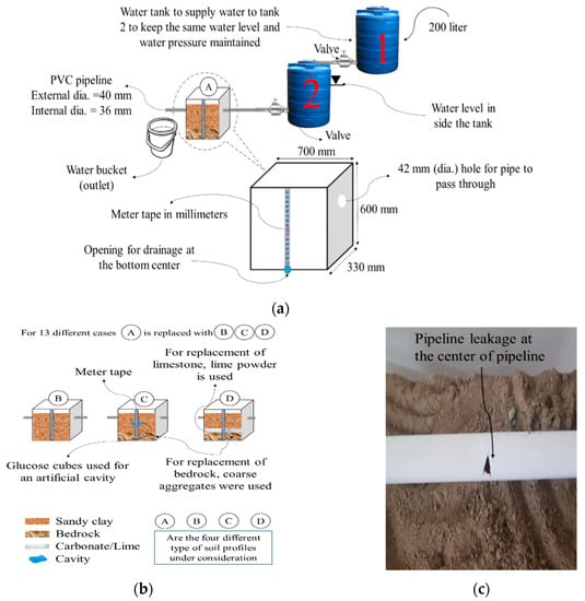 The first stage of the experiment was to design the architecture in the laboratory. The overall architecture of the experimental setup is shown in Figure 1a. Water was supplied to the system from a water tank (Tank 2) with a capacity of 227 liters. The water passing through the pipeline was collected at the other end (outlet). The collected water at the outlet lets the authors know about the quantity of water, which is seeped into the model box through the leakage. In total, 200 liters of water were inside the water tank for each case. The pressure of the water flow declines steadily with the water level inside the water tank (inlet), so another water tank (Tank 1) was used to maintain the water level in Tank 2 to control the drop in water pressure, as shown in Figure 1a. A solenoid valve was fixed at the bottom of each water tank to manually control the flow of water inside the pipeline. A PVC (Polyvinyl Chloride) pipeline with an external diameter of 40 mm and internal diameter of 36 mm was used. Artificial leakage was created by making a hole in the pipeline, as shown in Figure 1c. The model box used for the experiment had dimensions of 700 mm (width) × 600 mm (length) × 330 mm (height) with a hole at the center of the bottom for drainage. The different subsurface soil profiles considered in this study comprised bedrock, carbonate rock, cavities, sand, and clay.