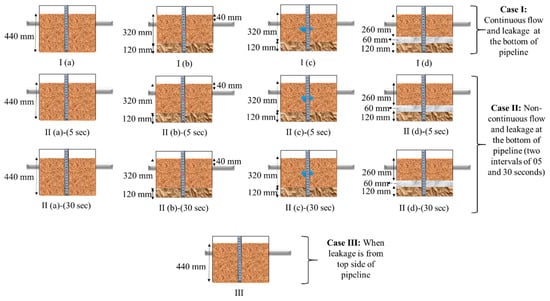 In this study, the two types of flow of water inside a water pipeline were adopted by considering the real scenarios. As in real scenarios, the water pipelines may have continuous or cyclic flow inside a pipeline; either it is water or sewer pipeline. Karoui et al. (2018) [] also showed that the ground subsidence is more rapid for cyclic flow compared to continuous flow. The authors in [] performed physical modeling of a sewer pipe defect in a silica sand model box in a laboratory to understand the sinkhole mechanism and the effect of water. Similarly, when real scenarios are considered, the leakage position in a water pipeline can be either at the top (the surface of pipeline that is not in contact with water) or at the bottom (the surface of the pipeline that is in contact with water) of a water pipeline. Hence, the authors considered two different types of flows of water inside a water pipeline and leakage locations on a water pipeline.