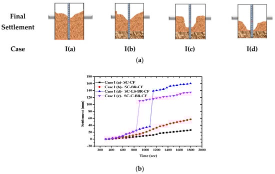 (a) Final settlement or collapse of each soil profile in case I. (b) Graphical representation of settlement vs. time for each case in Case I of continuous flow (CF).