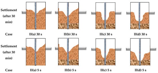 In real scenarios, the flow in a sewer pipeline is not always continuous. Thus, cyclic flow was considered in Case II with two different time intervals: 5 and 30 s. The cyclic flow in the pipeline was achieved by manual control of the valve. For the first cyclic flow, the valve was opened and then closed every 5 s. For the second cyclic flow, the valve was opened and then closed every 30 s. The results are shown in Figure 4. For Case II(a), the two cyclic flows were tested with the SC soil profile to observe the settlement rate. For the 5-s cycle, the maximum settlement was 32 mm; for the 30-s cycle, the maximum settlement was 30 mm. Case II(b) used the SC-BR soil profile; this time, the maximum settlements for the 5-s and 30-s cyclic flow were 66 and 62 mm, respectively. No collapse was noted for either the SC or SC-BR soil profile with the two cyclic flows. Case II(c) used the SC-C-BR soil profile and had maximum settlements of 156 and 150 mm for 5 s and 30 s, and Case II(d) used the SC-LS-BR soil profile and had maximum settlements of 183 and 175 mm for the two cycles, respectively. In Cases II(c) and II(d), both soil profiles collapsed after some time, as shown in Figure 5.
