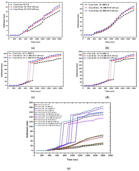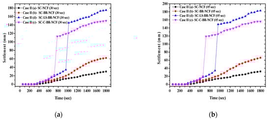 For Case II, the settlement results with the two cyclic flows over time are presented in Figure 7a–d for each soil profile of SC, SC-BR, SC-C-BR, and SC-LS-BR, respectively. It can be noticed that in each case, the 5-s cyclic flow caused more settlement than the 30-s cyclic flow for each soil profile as illustrated in Figure 7a–d. The cyclic flows also caused more settlement than the continuous flow for each soil profile.