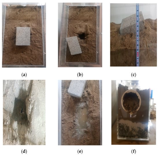 Over time, the size of the cavity increased, and the load (brick) above the leakage collapsed downward (Figure 6c). The condition of the soil collapse is shown in Figure 6d after removing the load (brick). Then, the pipeline became blocked by the continuous intrusion of soil (Figure 6f). After the pipeline was blocked, water started to come out from the leakage point where the sinkhole was created (Figure 6e).