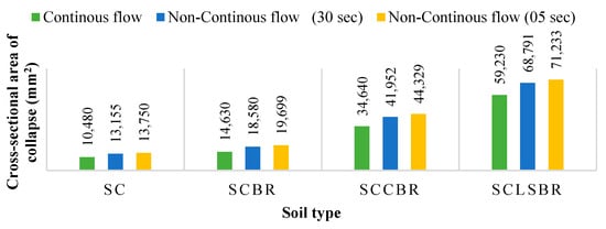 The area of settlement or collapse was also noted to vary for each case under different conditions, as given in Table 6. The histogram in Figure 8 also clearly shows that the SC-LS-BR soil profile had the largest area of collapse under the various conditions.