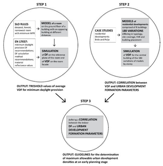 As stated in the introduction, the objective of this study was to formulate a methodology for urban planning recommendations (i.e., guidelines) of residential developments based on daylighting requirements for occupied residential rooms, as stipulated in EN 17037. Although the requirements of the stated standard are not directly applicable to urban planning, they can be applied indirectly. This can be achieved by linking the daylighting of a typical room defined by specific legislative restrictions about its geometry and minimum required area of windows to the overall insolation and daylight potential of a building in the context of a specific urban setting. The proposed relationship can then be used to define guidelines regarding maximum urban densities that still allow for the minimum required daylighting of indoor spaces at the stage of urban planning prior to the commencement of detailed architectural design. The main advantage of the proposed approach to the urban planning of residential developments is in the way indoor daylighting requirements are already considered at the urban level and therefore contribute to better indoor living conditions and, at the same time, to sustainable land use. In order to achieve the stated objective, the presented study implemented the following three phases (Figure 1):
