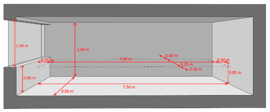 In order to establish the minimum average VDF on the facade of the building for its interior to comply with the daylighting requirements of the EN 17037 standard, the daylight provision for a model of the deepest, lowest and narrowest room permissible according to the Slovenian Rules on minimum technical requirements for the construction of apartment buildings and apartments [21] was modelled. Specifically, this means that a room of 3.75 × 7.50 × 2.50 m (w × d × h) was placed on the ground floor and in the center of a 45 m long and 15 m high building. The exterior facade wall was presumed to be 400 mm thick and included a window with dimensions of 3.75 × 1.50 m (w × h) and a 0.90 m high sill. The geometric characteristics of the derived model are presented in Figure 2. The light transmittance (LT) of the glazing was presumed as 0.65, corresponding to the values characteristic for contemporary insulated glazing units, while the whole window was set back 150 mm from the external facade surface. The size of the window used is the minimum allowed by the Rules on minimum technical requirements for the construction of apartment buildings and apartments and corresponded to the WFR of 20%. The reflectance of the interior walls, ceiling and floor were set at 0.5, 0.7 and 0.2, respectively, while the outside ground was given the reflectance of 0.2 and the building’s facade 0.3, all according to the recommendations of EN 17037.