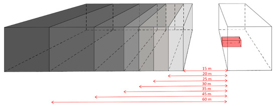 Subsequently, simulations with the addition of an opposing building with the dimensions of 45 × 15 × 15 m (w × d × h) at a distance of 60, 45, 30, 25, 20 and 15 m, were carried out, in order to reduce the amount of daylight on the facade due to overshadowing (Figure 3). Again, the percentage of grid points on the interior grid to exceed DF > 1.8% and DF > 0.6% as well as the corresponding VDFavg on the facade grid of the test room were observed. Afterwards, the interior analysis grid was shortened to correspond to 7.0, 6.0, 5.0 and 4.0 m depths of the rooms, with the percentage of the grid points on the interior grid to exceed DF > 1.8% and DF > 0.6% recalculated. In this way, a certain flexibility of choice in the use of the proposed guidelines formulated and presented in Step 3 is offered to the planners. In other words, the results for shorter depths can be used when planners willingly decide to provide appropriate illumination only up to a certain depth of the room, in order to achieve higher site densities.