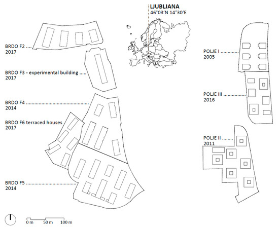 Simplified models of residential developments were defined in accordance with the characteristics of the recently constructed developments. Brdo [46] and Polje [47] in Ljubljana, Slovenia (Figure 4). These were chosen as case studies on the grounds of being the largest publicly funded housing developments recently built in Slovenia, with their design stemming from public architectural competitions. Brdo is an example of a mid-rise development of linear residential buildings, while Polje incorporates different forms of mid-rise residential point buildings (Figure 4). Both developments were built in phases, Polje between 2005 and 2016 and Brdo between 2014 and 2017. For the purpose of the presented study, selected phases of each of the two residential developments were used to define archetypical urban geometric configurations. Specifically, Polje I, II and III, and Brdo F4 and F5 (Figure 4) were selected as sources for point and linear building residential development configurations, respectively.