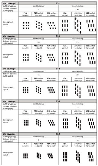 In archetypical models, point buildings with the dimensions of 22 × 18 m were placed parallel at a distance of 24 m on a plot to result in the site coverage of 0.31, with the plot boundary encompassing the corners of the outermost buildings. Correspondingly, linear buildings with the dimensions of 16 × 45 m (w × l) were placed on a plot at a distance of 30 m to create the site coverage of 0.31. Two further models were derived by shifting buildings vertically (along the longer side of the building) and horizontally (along the shorter side of the building) to create two variations of a chessboard pattern for the evaluation of different geometric correlations between individual buildings (Figure 5). Subsequently, the resulting six residential development patterns were densified by narrowing the space between the buildings. Specifically, this means that the distances between point buildings were changed from 24 m to 20, 16, 12 and 8 m, while in the case of linear buildings the distance between them was reduced from 30 m to 25, 20, 15 and 10 m. Such densification resulted in plots with site coverages of 0.31, 0.36, 0.42, 0.50 and 0.62, as shown in Figure 5. Floor to area ratio (FAR) and building height to building distance (H/D) ratios were calculated for heights of buildings ranging from 3 to 8 stories, with the story height approximated to 3 m. The resulting 180 variations were used to study the correlation between the requirements for daylighting expressed through minimum acceptable facade VDFavg, urban density and residential development typology and placement of buildings. Each individual variation was identified by an unambiguous code (e.g., P1A) and stated FAR value (Figure 5). The first letter designates the shape of the building (i.e., L—linear, P—point), the number defines the site coverage (i.e., 1—site coverage of 0.31, 2—site coverage of 0.36, etc.), while the last letter describes the shape of the urban pattern (i.e., A—parallel, B—shifted vertically and C—shifted horizontally).