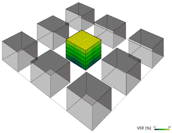 For the simulations of VDFavg on the building envelope, the facades of the central building of the models (worst case scenario) were divided into story-high segments (3.00 m), upon which a grid with cells of 1.00 m × 1.00 m in size was placed (Figure 6). VDF for each of the intersection points was simulated, resulting in the determination of VDFavg for each individual story.