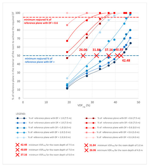 Figure 7. Average vertical daylight factor (VDFavg) vs. the percentage of the reference plane in the room with the minimum achieved daylight factor (DF) according to EN 17037. The X marks denote the threshold values of VDFavg for the fulfilment of the DF > 1.8% at more than 50% of data point criteria.
