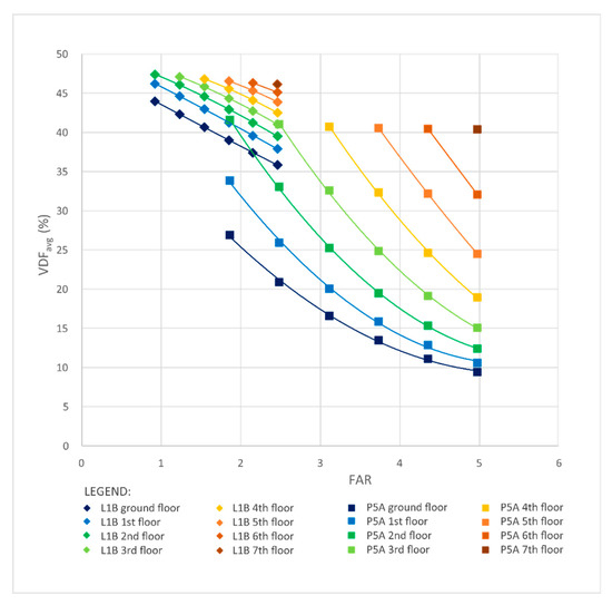 Figure 8. VDFavg on facade for different story’s and FARs for the L1B and P5A cases.