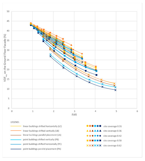 Since the ground floor represents the worst-case scenario in terms of daylighting, average vertical daylight factors on the ground floor facade for different placements and heights of point and linear buildings with different site coverage values were subsequently compared. The results of the simulations of VDFavg on the ground floor facades are summarized in Table A3 in the Appendix A. The analysis (Figure 9) shows that VDFavg on the ground floor facade decreases with the increase of FAR, showing a strong negative correlation, with the Pearson Correlation ranging from −1.00 for variations with lower site coverage to −0.98 for variations with higher site coverage.
