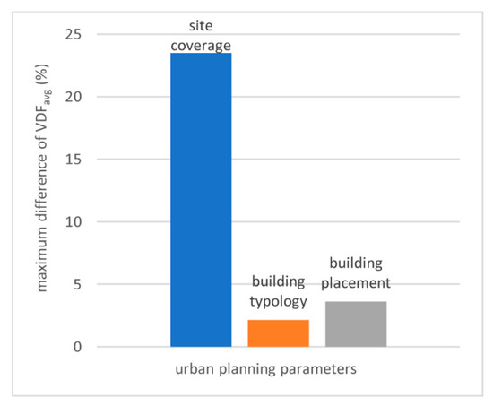 Figure 10. Impact of studied urban planning parameters on VDFavg on the ground floor facades.