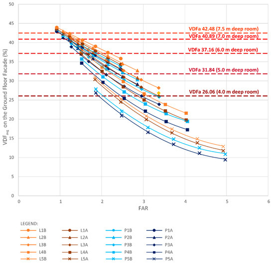 Therefore, the VDFavg values on the facade grid corresponding to the fulfilment of the criteria of DF > 1.8% across more than 50% of the interior reference plane were set as threshold values for further examination of the correlation between the daylight potential of the test building and the studied residential development formation parameters. The defined VDFavg thresholds were calculated from the polynomial trendlines (R2 > 0.99) connecting the values of VDFavg on the facade of the building with the percentage of the grid points on the reference plane exceeding DF of 1.8% at different room depths. The exact values show that for the fulfilment of the stated criteria for 7.5, 7.0, 6.0, 5.0 and 4.0 m room depths with the corresponding WFRs of 20.00%, 21.43%, 25.00%, 30.00% and 37.50%, the minimum necessary values for VDFavg are 42.48%, 40.89%, 37.16%, 31.84% and 26.06%, respectively (Figure 7). Specifically, this means that a facade VDFavg of 42.48% (3.97 percentage point reduction in VDFavg compared to the unshaded facade) already results in inadequate daylight provision in the instance of the 7.5 m deep room. Correspondingly, the value of the required minimum VDFavg on the facade declines with the decrease in the depth of the room and reaches 53.90% of the unshaded facade’s VDFavg value (VDFavg of 25.04% compared to 46.45% of the unshaded facade) in case of a 4.0 m deep room.