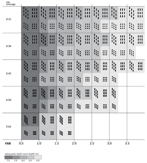 The findings of the final analysis of the two optimum placements of point and linear buildings are summarized in a diagram (Figure 12), where the relationship of the floor area ratio, site coverage and typology of the residential development with respect to the successfully daylit room depth of the room on the ground floor of the building is depicted.