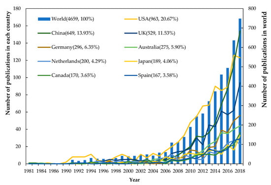 The 4659 articles in the search results are from 127 countries. Figure 1 lists the trends in publications in the 10 countries with the highest number of publications. It can be seen that international research on household energy consumption is roughly divided into three development stages: the cognitive stage from 1970 to 1990, the inquiry stage from 1991 to 2005, and the rapid development stage from 2006 to now. During the inquiry stage, the study from British and American was in a leadership position. With the break out of the Gulf War in 1991 and the implementation of the 1992 Energy Policy Act by the US Congress which requires the energy-related departments should improve energy efficiency standards when formulating policies. All of these have promoted the development of research about residents’ energy consumption in this period. During the rapid development stage, international scholars’ enthusiasm for research on household energy consumption has grown rapidly, with an average annual increase of 23.23% in number of published papers. According to the Global Energy Balance Sheet of the IEA, the global energy consumption by residents accounted for 21.24% of total energy consumption, while industrial energy consumption accounted for 29.03% of total energy consumption in 2017 [].