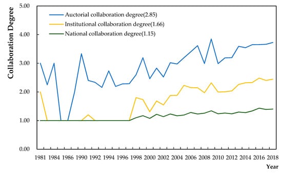 By collating the data of 4659 documents retrieved from this field into the above Equations (1)–(3), we can find that the collaboration degree among the authors, institutions, and countries in this field are 2.85, 1.66, and 1.15, respectively. Calculating the data of the three indicators for each year from 1980 to 2018 and making a line chart (Figure 2). It can be seen that the degree of collaboration at the national level has increased year by year since 2000, and the degree of institutional collaboration has also shown an overall upward trend, while the auctorial collaboration degree has increased alternately from beginning to end.