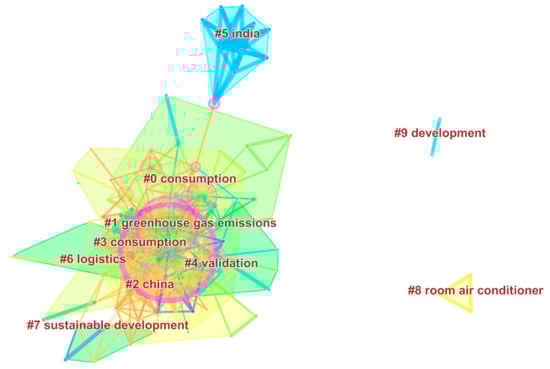 The co-word analysis method was first proposed by Callon, a French bibliometrician, to determine the relationship between topics by focusing on the common occurrence of vocabulary pairs and name phrases in the literature []. The topic words in the paper are used as statistical objects, and the number of times that different topic words appear in the same paper is used to form a common word network composed of noun phrases or word pairs. In addition, the evacuation distance of the subject content is reflected by the distance between routines within the network. The co-word clustering analysis in this paper is mainly based on Citespace software (v_5.0.R4), which is used to identify and display new trends in scientific literature. In addition, Citespace is a citation visualization analysis software developed gradually under the background of scientometrics and data visualization. Through the co-occurrence of keywords, dynamic evolution, collection, and analysis of important nodes in network relationships, the hotspots and development processes of residential energy consumption can be concluded. The size of the nodes in the graph indicates how often the keywords appear. The higher the keyword’s appearance frequency, the larger the node, which also means stronger centrality. The connection between the nodes indicates the common appearance of the keyword [,].