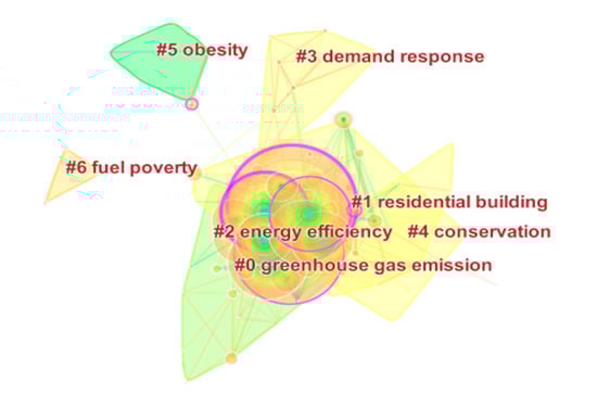 In the keyword clustering from 2006 to 2018, cluster #0 “GHG emission“ contains relevant research content including natural gas, electricity consumption, and residents’ income, which is usually regarded as the main influence factor of GHG emission; Cluster #1 “residential building” also touches importance on topics such as income and GHG; the research contents of energy use is reflected in clusters #2 and 3, including rebound effects, residential behavior, and energy management. Research on energy use can clarify the impact of human factors on energy efficiency and promote the sustainability of household energy consumption; it can be seen from the keywords of cluster #4 that the topic of energy conservation and environmental protection has attracted more and more attention, which can promote the “Ecological Civilization”; cluster #5 is related to food health consumption such as diet health, sugar intake, and obesity. Broadly speaking, household energy consumption involves people’s common life, including food, clothing, transportation, etc. Thus, there exists a relationship between energy consumption and human health, for example, obesity. Previous studies have proven that the lifestyle of relying on a car instead of walking may result in obesity and then affect household energy consumption [,]. In another way, the search results may include results of energy intake of human being, mixing household energy consumption with human energy intake. However, this does not affect the final result significantly. The keywords at this stage are: GHG emission, residential building, energy efficiency, household behavior, environment, etc. Through the content analysis of each clustering result, it can be proved that the research direction at this stage is mainly reflected in GHG emissions, the relationship between household income and residents’ behavior and energy consumption, environmental protection, modeling and measurement, etc.