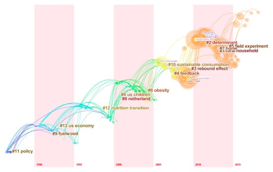 Cited references refer to two articles cited by the same reference. By analyzing the clusters and key nodes in the co-citation network, it is possible to reveal the knowledge structure, knowledge base, evolution of the research front, and the literature that played a key role in the evolution process. In this paper, we use the Citespace software to draw a co-cited clustered time zone view map of the literature on the energy consumption of households in order to discover the knowledge base in this field and the evolution of the research front. Based on this, an inductive summary is made to predict future research directions. The nodes in the figure represent the article needing to be analyzed, and the size of the nodes corresponds to number of citations of this article. The color and width of the inner circle of the nodes show the frequency of being cited in different periods. The connection between the nodes indicates the co-citation relationship. The degree of width shows the intensity of co-citation, and the different colors correspond to the time of the first co-citation. The change in color from cold to warm, i.e., from blue to red, represents a change in time from early to recent [,].